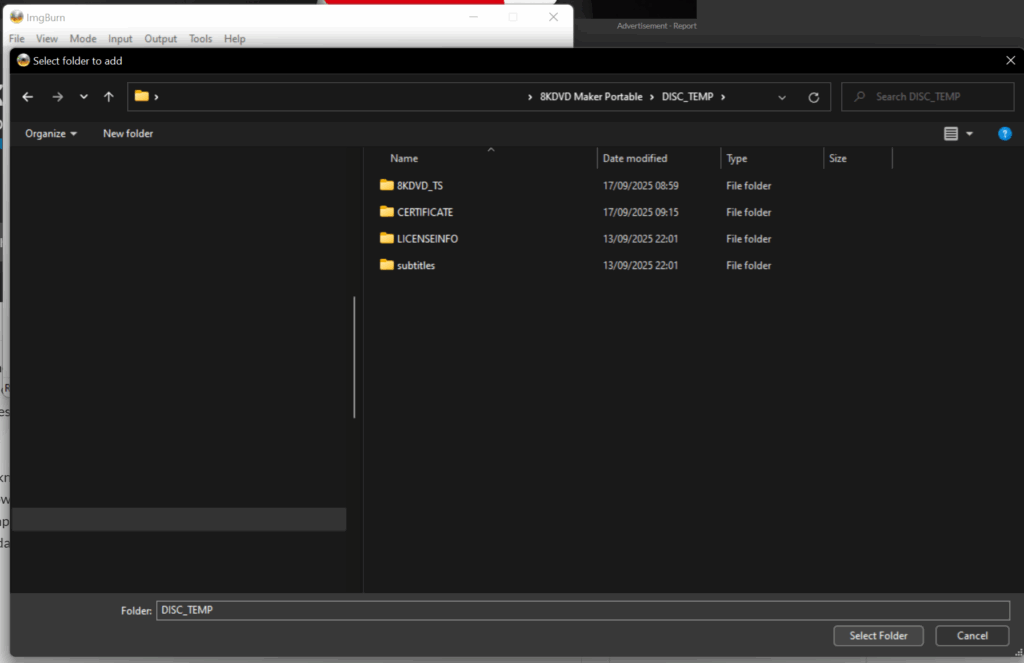 Step 4: Navigate to your 8KDVD Maker directory, select the DISC_TEMP folder, and click “Select Folder.”