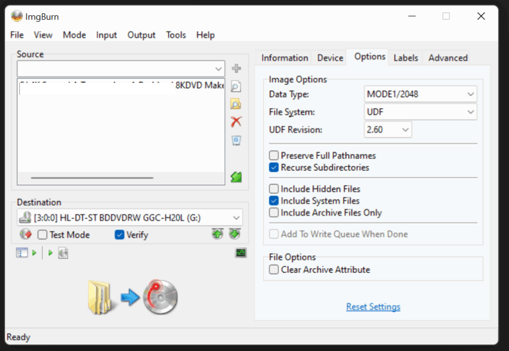 Step 5: Open the Options tab. Set File System to UDF and UDF Revision to 2.60. Ensure Recurse Subdirectories is enabled and Include System Files remains enabled.