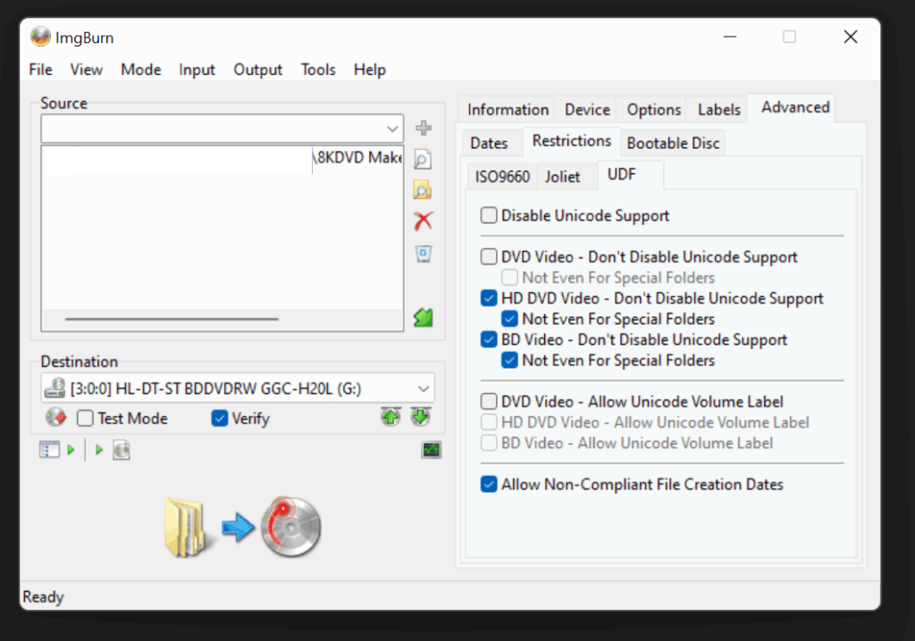Step 7: Open the Advanced tab, then Restrictions. Enable “HD DVD Video – Don’t Disable Unicode Support” and “BD Video – Don’t Disable Unicode Support.” Leave “Allow Non-Compliant File Creation Dates” enabled.