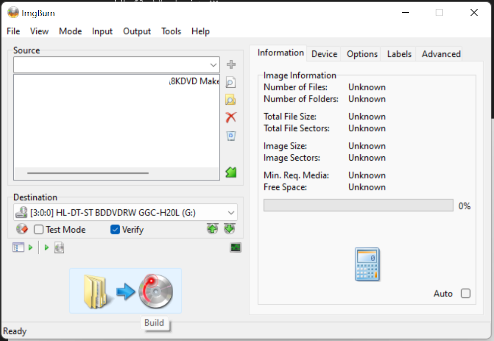 Step 8: Confirm Destination is your burner, insert suitable media (Blu-ray recommended; dual-layer DVD shown here), leave Verify enabled, and click the Build button.