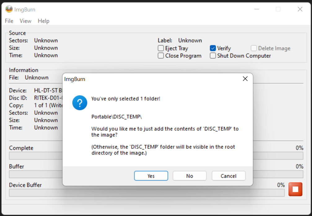 Step 9: When prompted “You’ve only selected 1 folder… Would you like me to just add the contents of ‘DISC_TEMP’ to the image?”, click “Yes.”